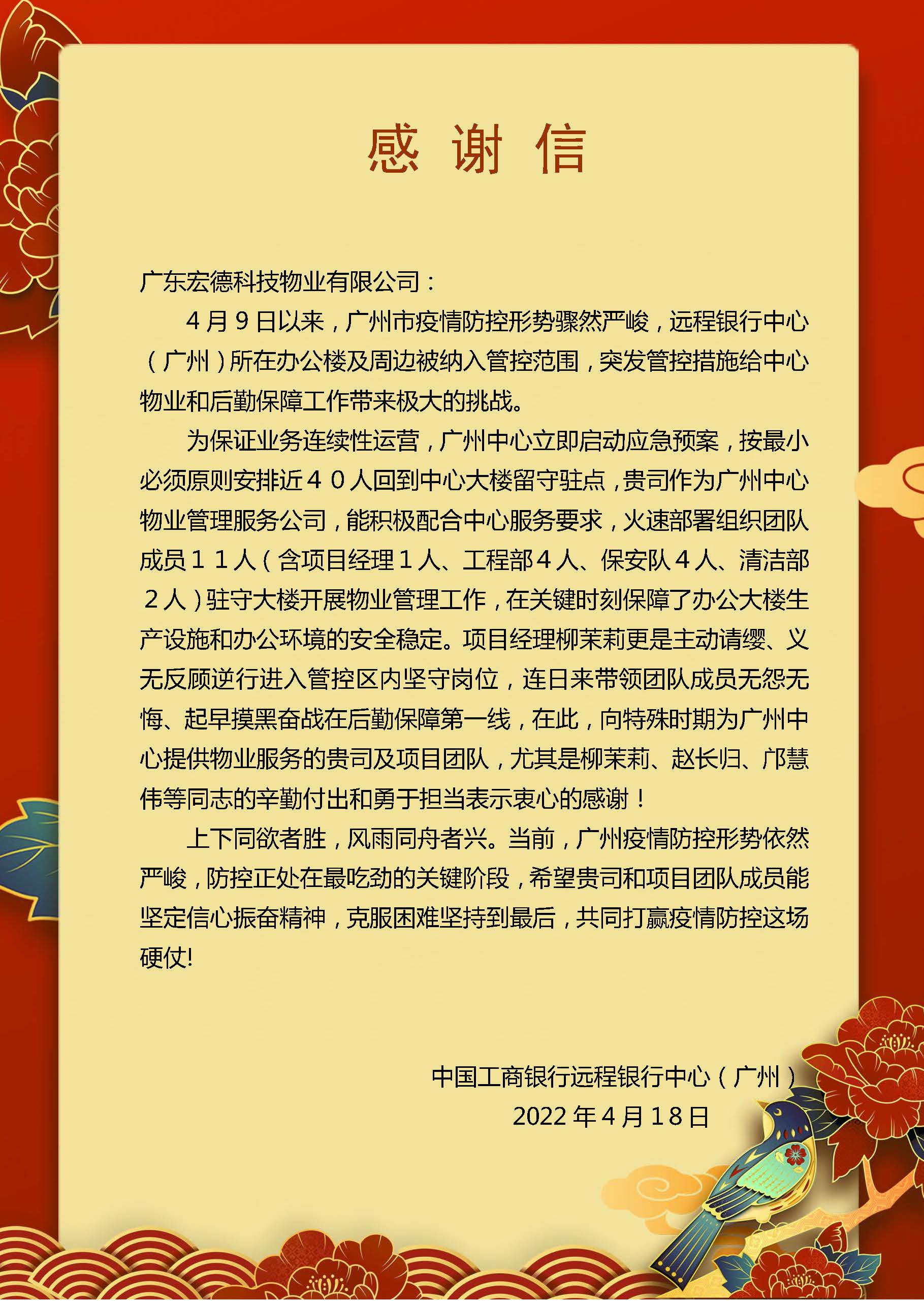 為此,工行遠(yuǎn)程銀行中心(廣州)向特殊時(shí)期為中心大樓提供物業(yè)服務(wù)的廣東宏德科技物業(yè)有限公司及項(xiàng)目管理團(tuán)隊(duì)的辛勤付出和勇于擔(dān)當(dāng)表示衷心感謝,并對(duì)項(xiàng)目經(jīng)理柳茉莉、保安主管趙長歸、工程管鄺慧偉等同志通報(bào)表揚(yáng)!