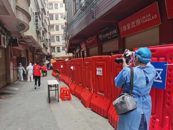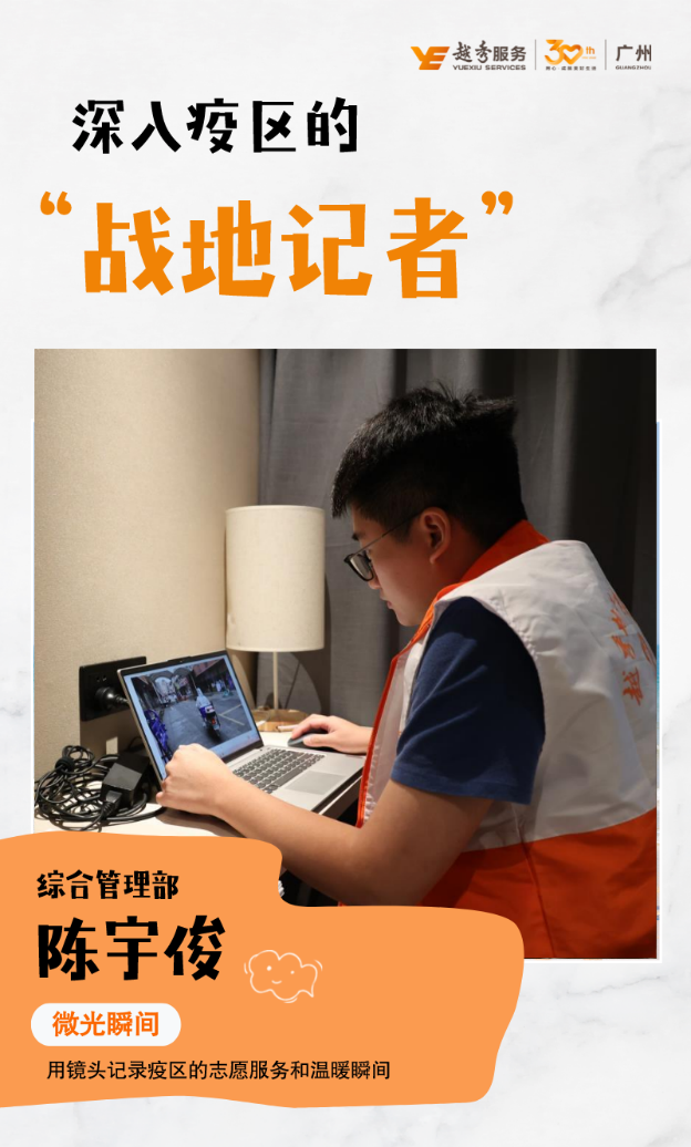 在馳援白云區(qū)抗疫的前線,只要有越秀服務(wù)志愿者的地方,你便不難發(fā)現(xiàn)一位身背單反相機(jī)的志愿者。4月13日,越秀服務(wù)第二批“抗疫先鋒隊”出征馳援白云,從這天起,陳宇俊便有了一個新的角色——戰(zhàn)地記者,用鏡頭記錄疫區(qū)的志愿服務(wù)和溫暖瞬間。